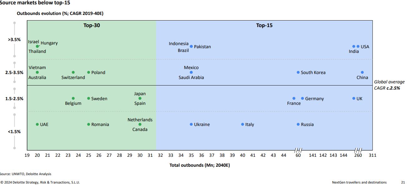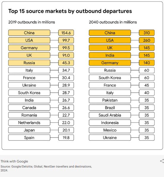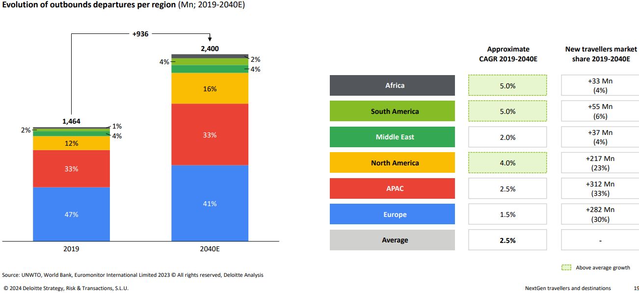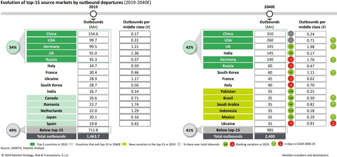 Ο παγκόσμιος τουρισμός αναμένεται να φτάσει περίπου τα 2,4 δισεκατομμύρια ταξίδια έως το 2040, μια σημαντική αύξηση κατά 936 εκατομμύρια σε σύγκριση με το 2019. Η Αφρική και οι Αμερικές προβλέπεται να σημειώσουν τη μεγαλύτερη ανάπτυξη στα εξερχόμενα ταξίδια, ενώ η Ευρώπη και η περιοχή Ασίας-Ειρηνικού θα συνεχίσουν να κυριαρχούν, συνεισφέροντας το 75% των παγκόσμιων αναχωρήσεων. Οι πέντε κορυφαίες αγορές προέλευσης θα αντιπροσωπεύουν το 42% του συνόλου, με νέους ανταγωνιστές όπως το Πακιστάν, η Βραζιλία και η Σαουδική Αραβία να εισέρχονται στις 15 κορυφαίες. Επιπλέον, περιοχές όπως η Ευρώπη, η περιοχή Ασίας-Ειρηνικού και τα ΗΑΕ αναμένεται να ξεπεράσουν τις 20 εκατομμύρια εξερχόμενες αναχωρήσεις ετησίως έως το 2040.