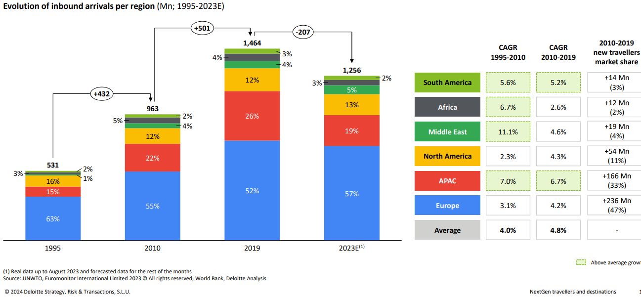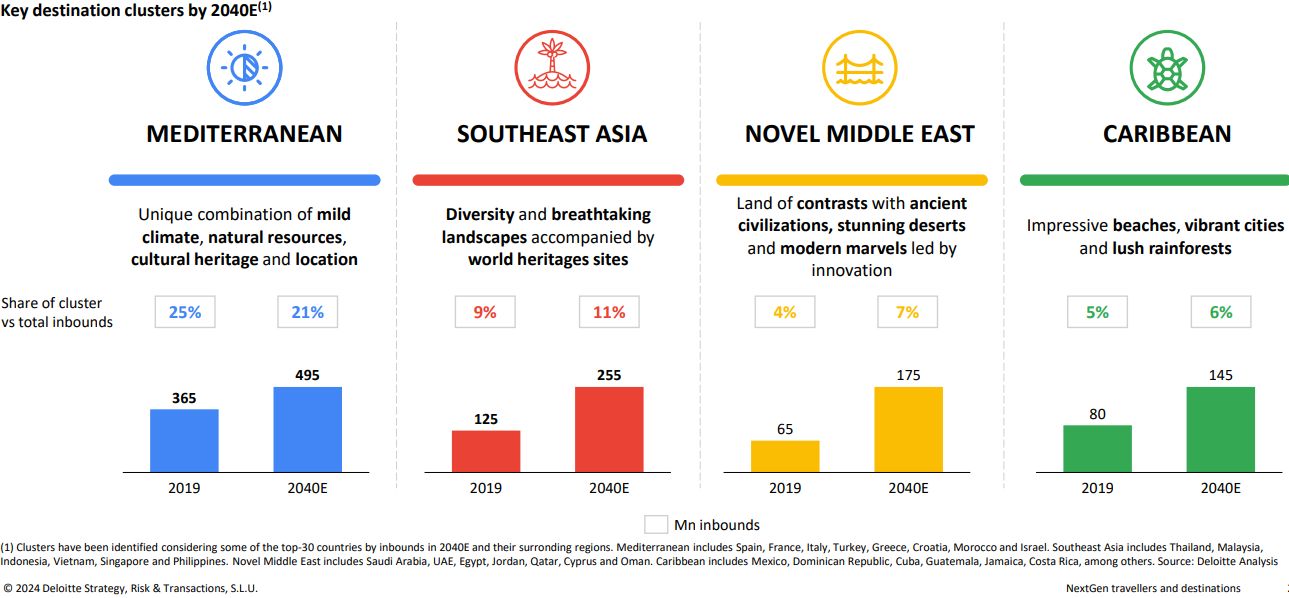 Βασικές περιοχές, όπως η Μέση Ανατολή, ιδίως η Σαουδική Αραβία και τα Ηνωμένα Αραβικά Εμιράτα, εκτιμάται ότι θα σημειώσουν ταχεία ανάπτυξη. Εν τω μεταξύ, καθιερωμένοι τουριστικοί προορισμοί όπως η Ισπανία και το Μεξικό προβλέπεται να διατηρήσουν τη δημοτικότητά τους, αλλά θα αντιμετωπίσουν αυξημένο ανταγωνισμό από αυτές τις αναδυόμενες αγορές.