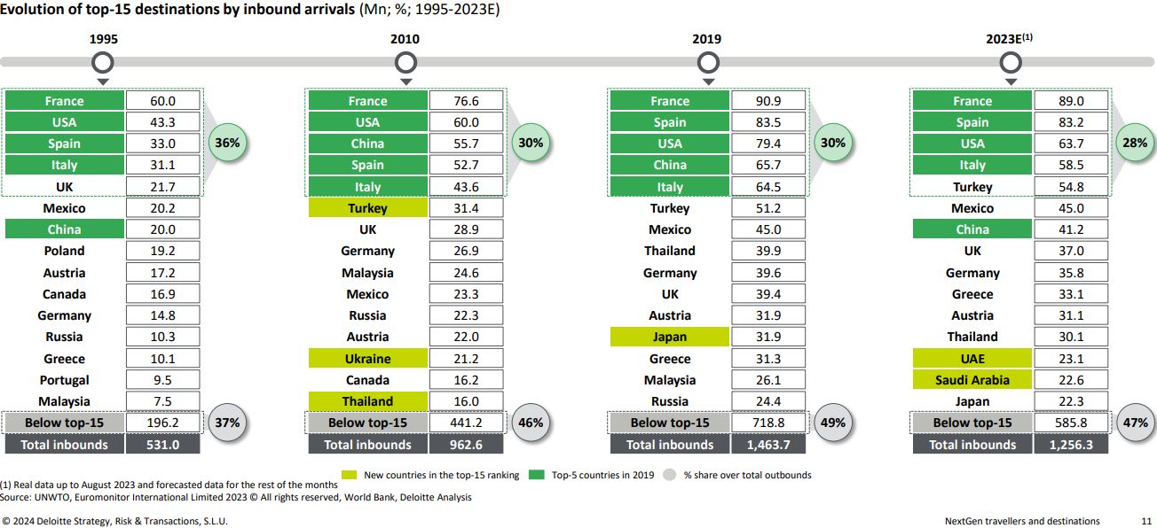 Την τελευταία δεκαετία, οι ευρωπαϊκές χώρες διατήρησαν την κυριαρχία τους στον παγκόσμιο τουρισμό, αλλά η ανάπτυξη στην περιοχή Ασίας-Ειρηνικού (APAC) και στη Νότια Αμερική ξεπέρασε τον παγκόσμιο μέσο όρο. Παρόλο που οι πέντε κορυφαίοι προορισμοί παρέμειναν σταθεροί από το 2010, παρατηρείται κατακερματισμός, με χώρες της APAC να ανεβαίνουν στη λίστα και προορισμούς εκτός των κορυφαίων 15 να κατακτούν μεγαλύτερο μερίδιο της αγοράς.